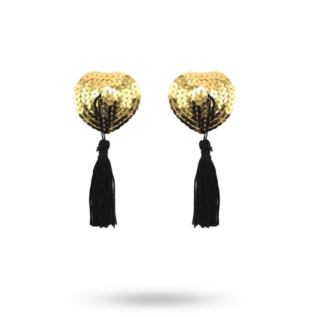 Sydämenmuotoiset nännisuojat, joissa on kimaltelevia strasseja ja mustat tupsut.