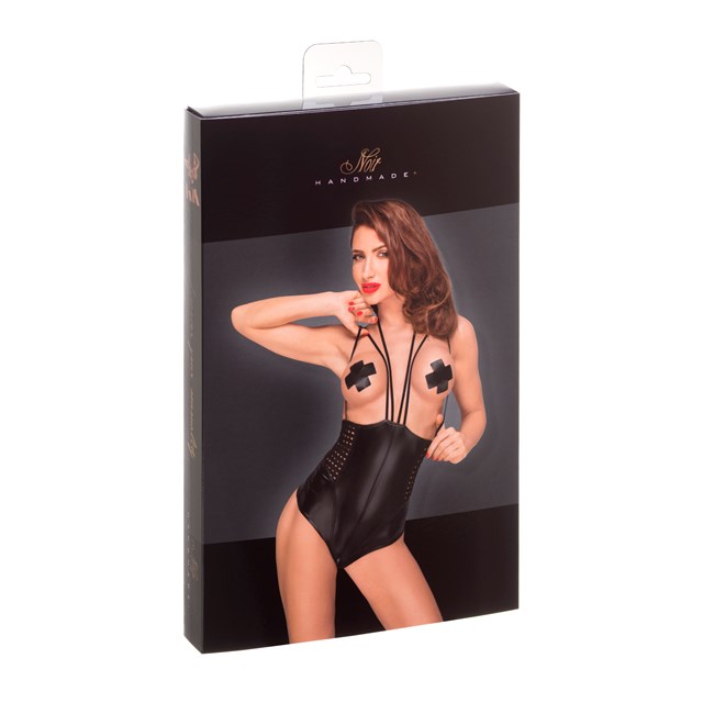 Seksikäs body powerwetlook materiaalista jossa on koristeelliset narut rintojen yllä ja sivuilla muotojasi imartelevat yksityiskohdat. Haaroissa ja selässä vetoketjut - täydellinen asu spontaaneihin seksihetkiin! Narut ovat joustavaa materiaalia.