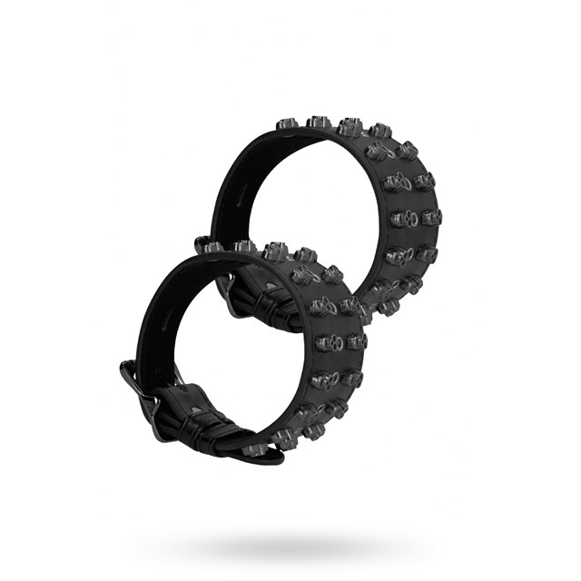 Kaksi riviä pieniä pääkalloka ja tukeva irrotettava metalliketju. Tehty korkealaatuisesta tekonahasta, tummanharmailla metallisilla yksityiskohdilla.