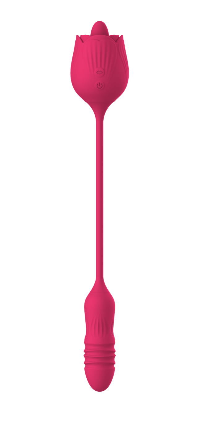 Tässä olisi erittäin monipuolinen seksilelu - toisessa päässä on klitorista imevä punainen ruusu ja toisessa päässä on sykkivä kuulavibra. Mitä muuta voisikaan enää toivoa?